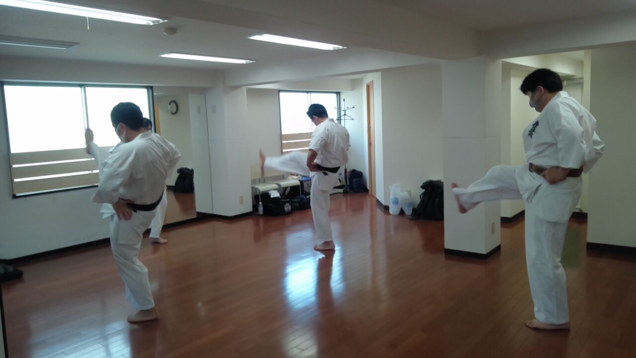 今日の技の稽古は構えて後ろ足から前蹴り→コンビネーション。