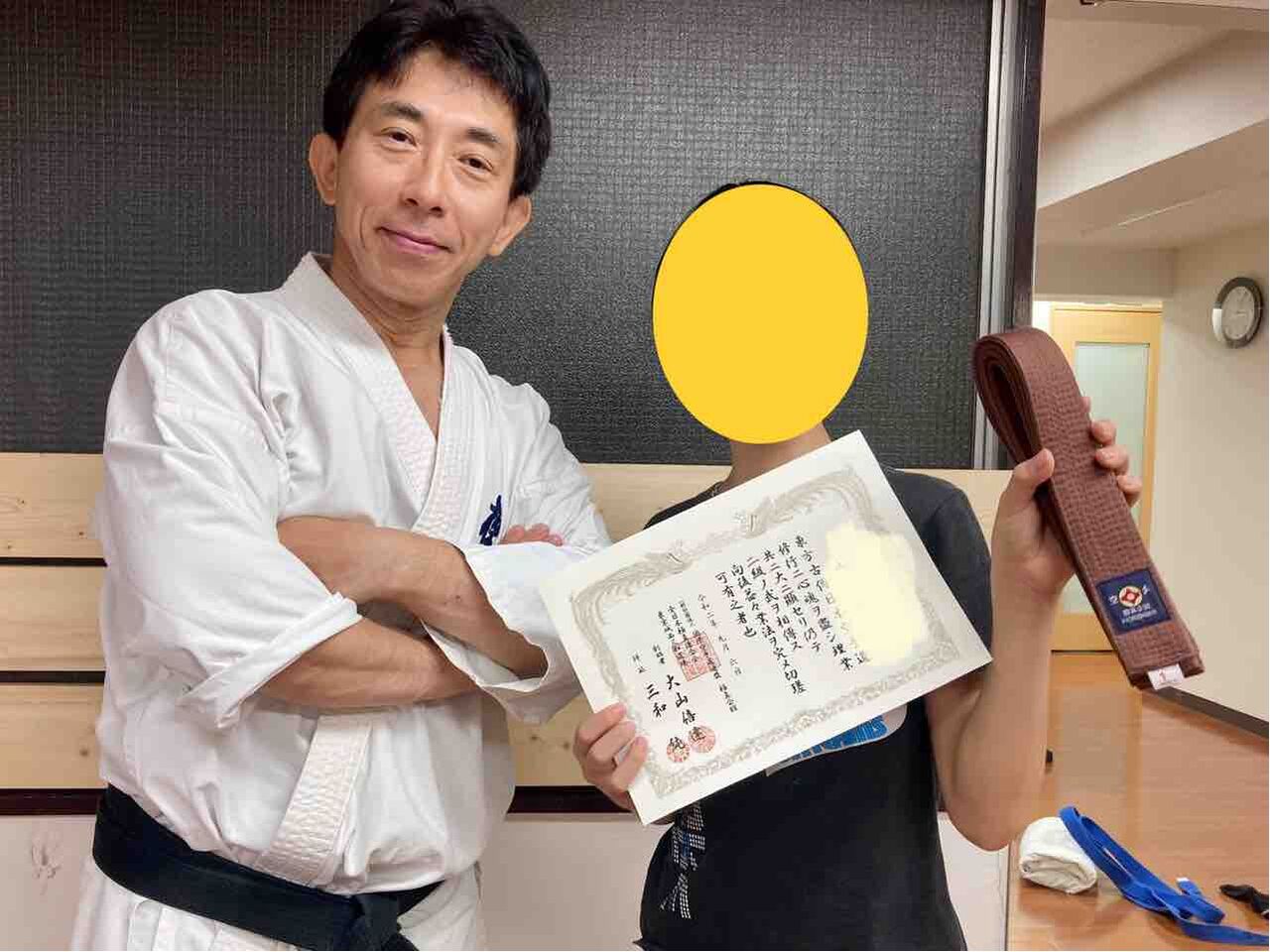 昇級のどさくさに紛れて、昇級した中学生のために、師範にツーショット写真をお願いしてみました。